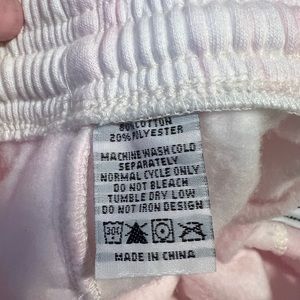 NWT by Samii Ryan and Dessie Jackson fleece jogger pants. Elastic waist and ankle. Pink and white tie dye background with a painted splotch design.