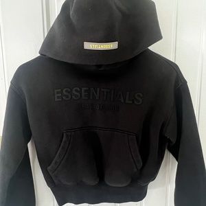 Hype beast all black Essentials Fear of God hoodie. In my opinion I think it runs a bit small, so I’d say it’s more like a size 4T.
