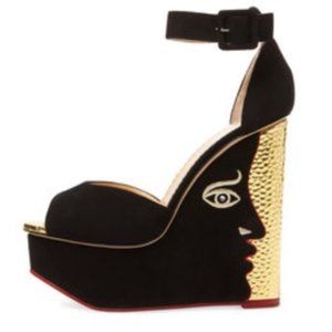 CHARLOTTE OLYMPIA’s ‘Two-Faced’ platform wedge sandals are inspired by Surrealism and abstract art. This Italian-made black suede pair is embroidered with a face on either side of the wedge, framed by a hammered gold panel and red trim. A 45mm platform makes the towering 6 inch heel more manageable.