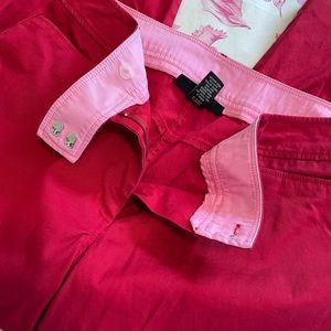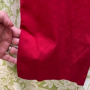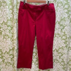 Super cute red cropped pants from Venezia. Some stretch, saturated red color, hook & zip closure, slight flare and slits at hem. Fun design, flattering cut, 2 front pockets, no back pockets. Excellent pre-owned condition. No flaws to note.