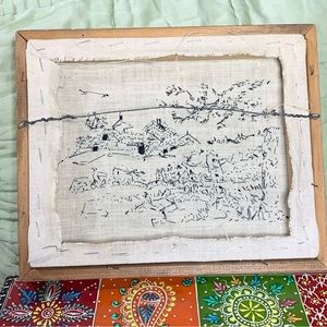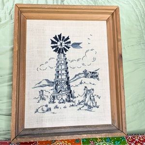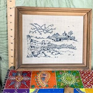 Pretty 70s vintage farm embroidery set of two. The embroidery is done in black thread and creates a pen and ink look. Tall windmill and barnyard with long fence. Nicely framed in rustic wood