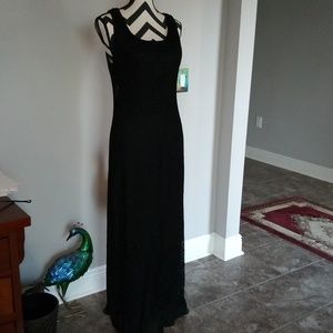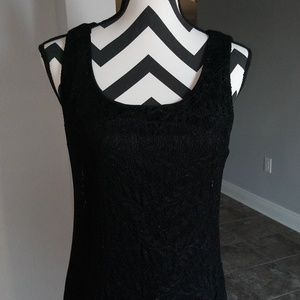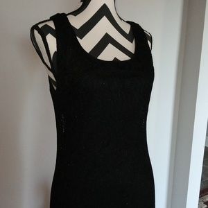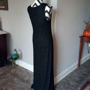 Lined lace dress in black. Good condition. Non smoking home. Size 12. Pullover dress that's stretchy. 56 in long. Armpit to armpit is 22 in. Dry clean or use dryel