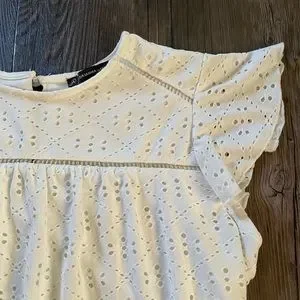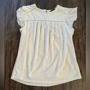 Beautiful blouse with great eyelet detailing and flutter sleeves. Nice stretch for super comfy fit. Perfect for dressing up or down, work or night out on the town! In excellent preloved condition.