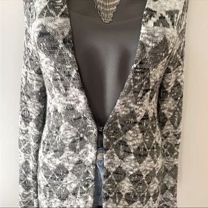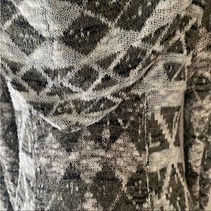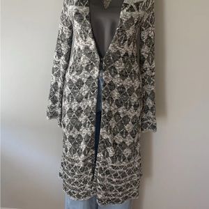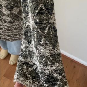 Free People hooded duster/long cardigan. The multicolored and multi-textured knit fabric features an Aztec pattern that gives it an ethnic and bohemian touch. The lightweight cotton blend material is perfect for a casual occasion, and the flared sleeves and hood add to the chic and stylish appearance. The sweater has a slim fit and comes in size S/P for a regular slim size type. The open front and 1 hook & eye closure feature makes it easy to wear. This cardigan is a perfect addition to your wardrobe if you want to embrace a nature-inspired theme. Length overall is approx 48/49. No visible signs of piling, rips or stains. In great pre-owned condition. Worn maybe twice. Great for late winter/early spring and fall. Could be worn also during late, cool summer evenings.