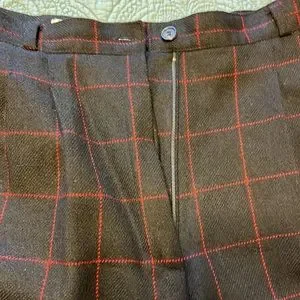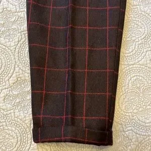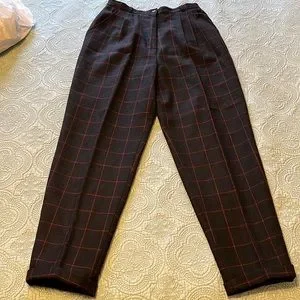 Vintage Pretense Wool Pants. Made in Japan. Black with red stripes. Tag says size 11/12 but measurements are more like a US 8-10. Fully lined, high waist, functional pockets, pleated front. Inseam: 28.5”, waist 29”.