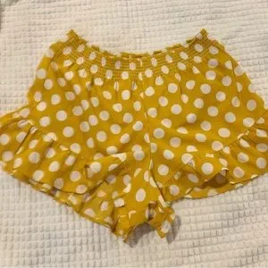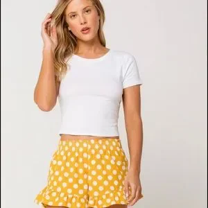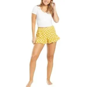 Volcom Newdles Shorts. When you want comfort without the frump... Made with a soft and airy bubble crepe material and stretchy waist, the polka-dot Newdles Short are just right for lounging at home after a day of hitting the waves. Allover polka dot print. High waisted pull on short. Smocked, fold over waist with ruffle at top edge. Asymmetric ruffle around leg opening. Metal badge at back waist. Inseam: 2". 100% Polyester. Machine wash. Imported.
