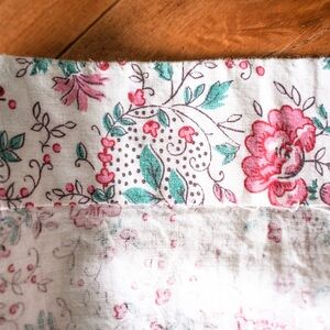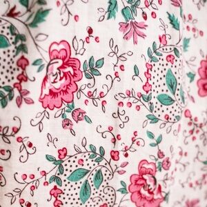 The white cotton sets the stage for pink budding flowers, teal green leaves, and adorable speckled dots on the enchanting block print. A closer look in the photo reference.