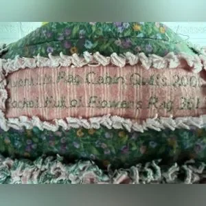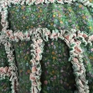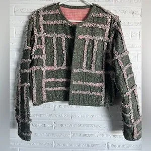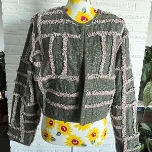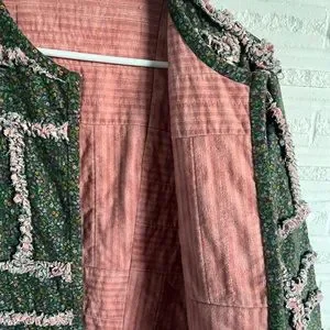 This beautiful floral jacket was lovingly made. It is in a similar style of designer Maria Barata. Green and dusty rose are the primary colors with a calico print and a lining of striped dusty rose fabric. The detail ribbon-like trim is made of the same carefully cut fabric. Size medium to large. Measurements: 21 inches pit to pit. 10 in long.