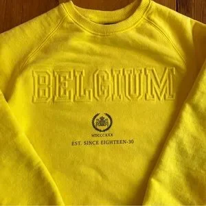 Belgium Designs super soft crewneck. The tag says M but shrunk and now it’s about an XS. Very well made sweater. Nice and bright. Very soft.