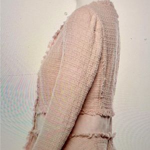 This pale pink, tweed pattern jacket is perfect for evenings or with jeans. It’s 60%cotton,33%polyester,7%wool. New with tags