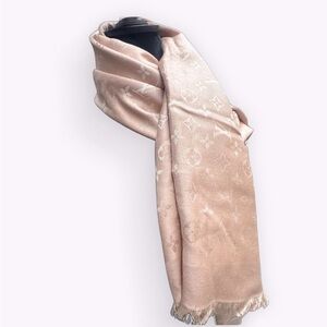 Authentic Louis Vuitton Blush Pink & Cream LV Monogram Denim Silk Wool Lightweight Wrap Scarf Shawl