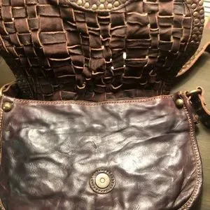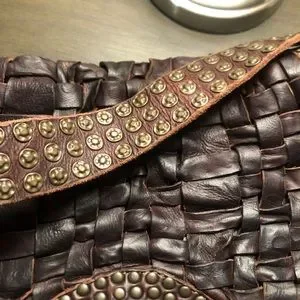 Frye ”Stacy” studded shoulder bag in dark brown woven Italian leather.