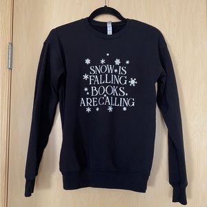 Bella + Canvas brand. Purchased from Piper + Ivy. SIZE XS. Unisex fit. Just decided to go up a size. Black background with white text. Soft & fuzzy inside. Long sleeve. Crewneck Pullover style Sweatshirt. Worn a couple times. Graphic says “Snow is Falling Books Are Calling”. Minor pilling.
