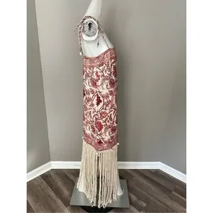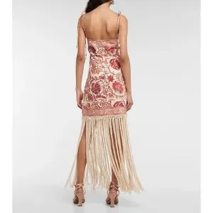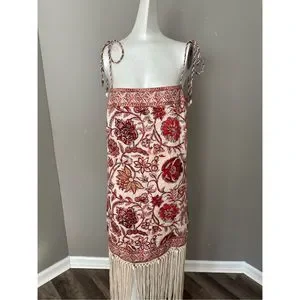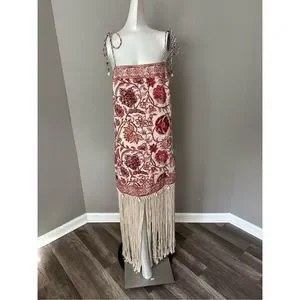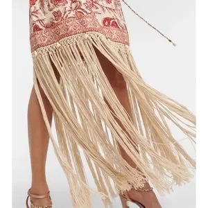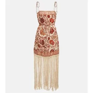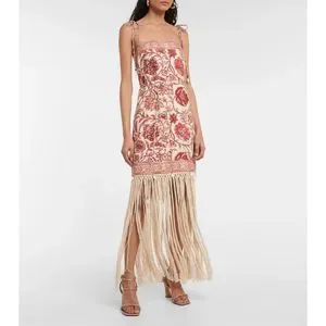 Characterized by artistic fringe all around the hemline, this mini dress brings to light the latest season's sepia floral print. Made from airy linen, it features rouleau straps and waist tie and shell toggle trims that complement the whole beach-look aesthetic.