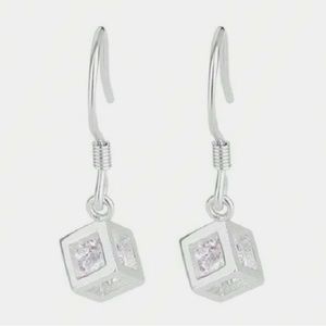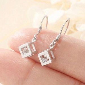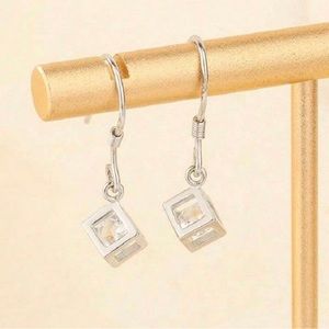 “Crystal in a Cube” Clear Swarovski Loose Free Floating Open Caged Captured Geometric Cuboid Square Block Brick Sparkly Classy Silver Dangle Earrings. Simple chic brilliant round-cut clear Swarovski loose crystal inside an open frame silver cube/cage to reveal its beauty & shine! New.