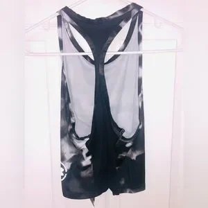 Black and white tie dye Under Armour Iso-Chill “Up the Pace” crop top. High scoop-neck. Racerback. Cropped. Mesh panel up center of back. Size small. Body made of 100% Polyester. Mesh back panel made of 90% Nylon, 10% Elastane. New with tags.