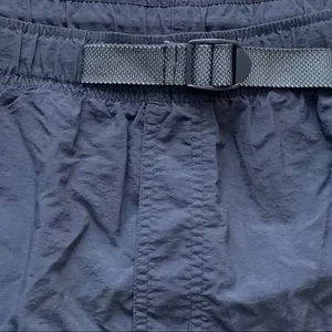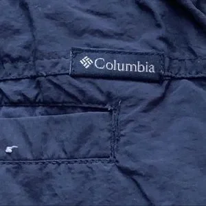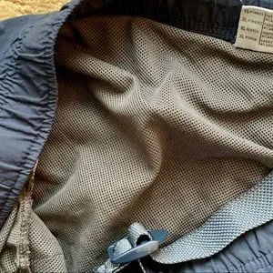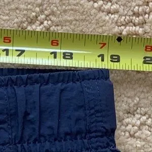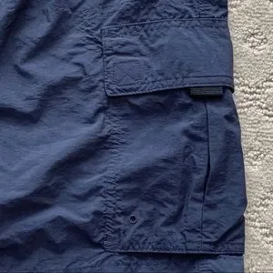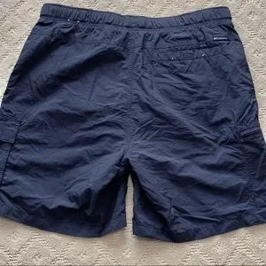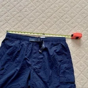 These swim trunks are in great preowned condition. They have an elastic waist along with a drawstring. There is a mesh interior brief. There is a pocket on the front with a Velcro flap and another pocket with a zipper. There is also a Reel Pocket with Velcro. The color is deep navy blue. Non-smoking home.