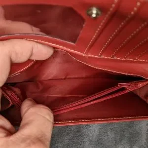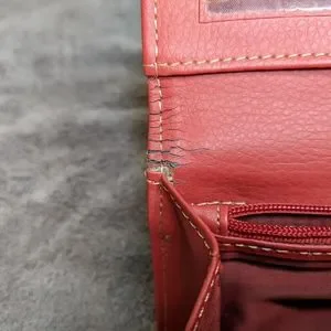 Cracks in leather on inner side of bag where wallet folds. Other than the cracks, light wear on exterior of bag.