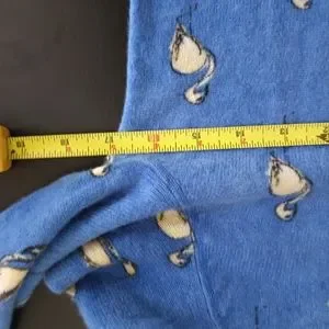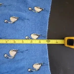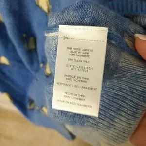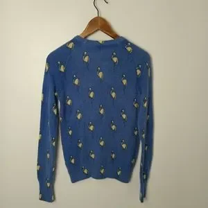 Cashmere Crewneck pullover sweater, blue with white flamingos. Intentional variegation of blue. In excellent pre-owned condition. No flaws, pilling or odors. This is a rare find.