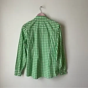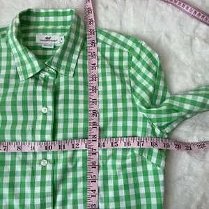 Green and white gingham button down long sleeve top by Vineyard Vines. 100% cotton. Excellent preowned condition other than one discolored mark at the color (see in photos). Size 6.