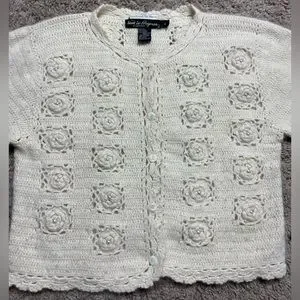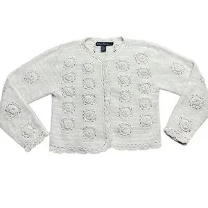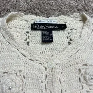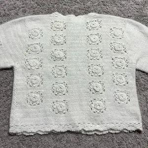 VTG Angora Crochet Knit 3D Flower Pearl Crop Cardigan Sweater S