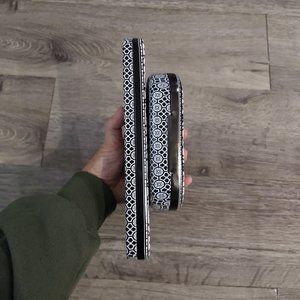 Bundle(2 items):Black and white tin containers. One case is for Jewelry and other is for sunglasses and/or glasses.