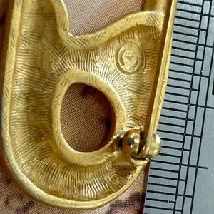 A classic haute couture form, satin finish gold tone large costume brooch pin shown with ruler to verify size. Working pin mechanism. Lovely preowned pin with very minor signs of wear and age. See ruler pics to confirm the size. Rulers and displays are not includes. See close up photo for the mark that looks like a copyright mark, but we can't be sure. Smoke free. Carefully packed. Ships fast with tracking. Costume jewelry. Vintage.
