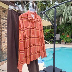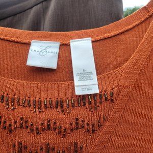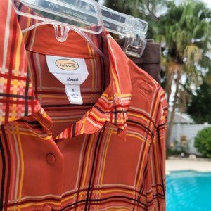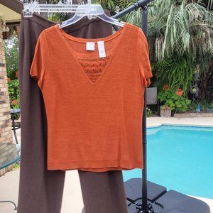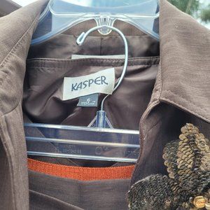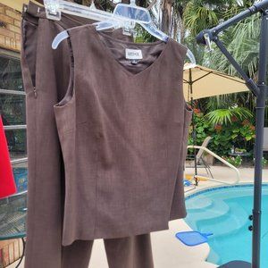 Perfect condition Fall-look soft brown Kasper pant/vest suit with 2 coordinating tops - a silk Talbots blouse and light-weight short-sleeve rust-colored sweater. Jacket is open front, allowing your smartly tailored vest and/or colorful tops to show. Well-suited for office or can be dressed down for active events.