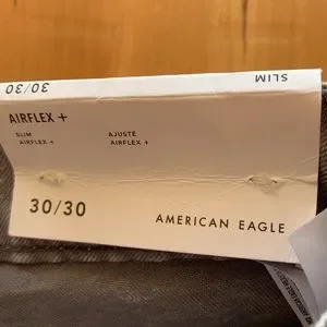 Men’s American Eagle Airflex+ jeans. Size 30 x 30, slim fit. Gray. 98% cotton, 2% elastane. Machine washable, tumble dry.