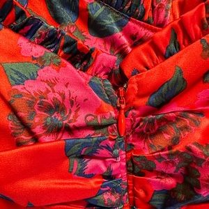 Body-hugging red stretch satin midi dress in a “vintage-inspired” floral pattern with delicate ruffle detailing at bust.