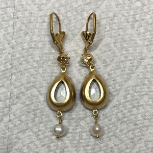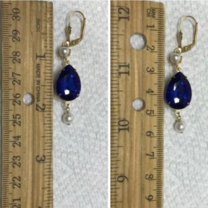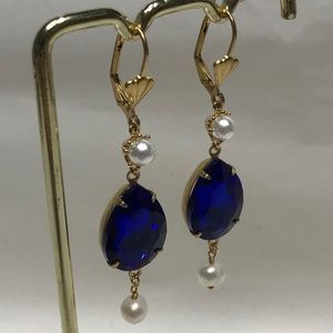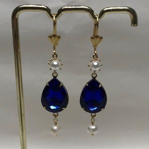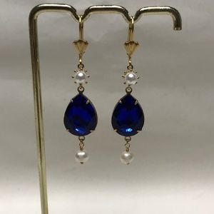 These earrings feature golden hinged back oblong loops as their base that securely latch in place, with a tiny gold Renaissance fan design on their fronts. A white faux-pearl connector trimmed in gold dangles from these. A cerulean blue teardrop glass faux sapphire hangs from the faux pearl connector of each earring. From each of the blue teardrops hangs a 6 mm white freshwater pearl. These replicas have been newly handmade just for you, they are 5.6 cm long by 1.3 cm wide, and relatively lightweight.