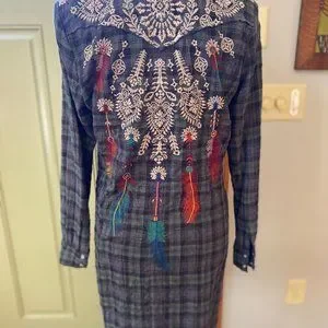 I LOVE this tunic, and really wish I could fit into it. But, alas, it's not to be. This tunic is a super soft flannel, with snap buttons. The intricate embroidery is mostly on the back, with some on the shoulders as well. The photos don't do it justice, but there are some good close ups of the embroidery. This is a NWT item.