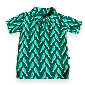 Size 4T Kickee Pants, parrot print short sleeve boys polo shirt. Organic bamboo. Light wear and cracking on the print, typical wear for this style and brand. No stains.