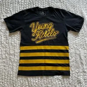 Boys ECKO UNLIMITED size (S) Pre-Owned Black with horizontal yellow lines. Young Rebels title.