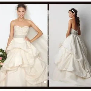 Ivory silk taffeta sculpted strapless ball gown with vintage lace inspired beading and embroidery on bodice. Bodice and skirt have subtle ivory tulle overlay, oyster grosgrain ribbon at waist. This dress retailed for over $2500