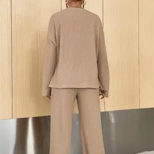 Khaki Casual Womens Drop Shoulder Half Button Tee & Pants