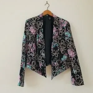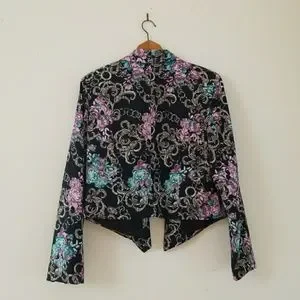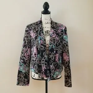 Funky fun, open-front, lightweight, lined, very soft with small shoulder pads. A great Spring Jacket.