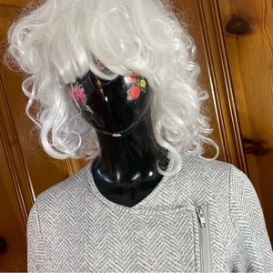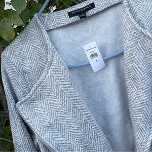 New with tag, soft, cozy, long fleece jacket from Banana Republic Factory featuring white and light gray herringbone stripe pattern, diagonal “moto” style zipper, and two nice pockets.