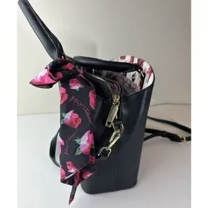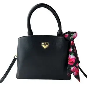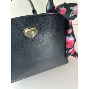 Exterior boasts dual rolled handles & Signature Betsey Johnson gold tone Metal Monogram Heart plate with detachable fashion scarf