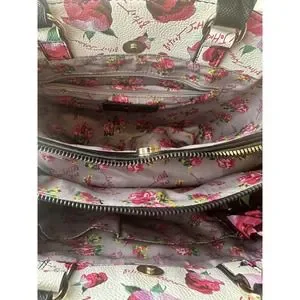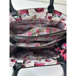 Triple entry Interior has center zipper compartment with two outside snap closure compartments & gold tone metal hardware signature Betsey Johnson floral lining plus back wall zipper pocket & two slip pockets