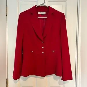Tahari pretty deep red women’s blazer / jacket. 3 snap front, flattering cut with pretty accents on front and back. Hardly worn, in great condition- size 8 - 100% polyester so washes great!
