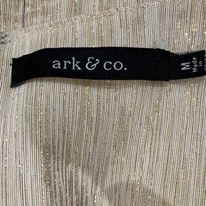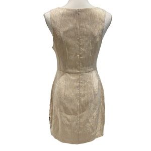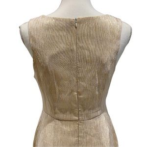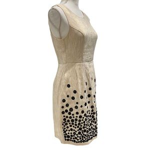 Ark & Co cream and gold sheath cocktail dress in size medium. Gorgeous metallic gold shine! High neckline with fitted torso. Skirt has stitched cascading polka dot design on front. Hidden back zipper with hook-and-eye closure. Fully lined. Preowned, excellent condition except for minor tear below bottom of zipper (see final pics). Easily fixed with quick stitch!