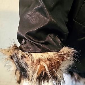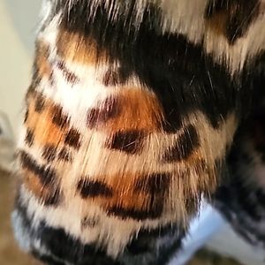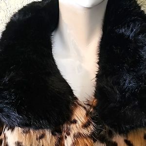 Black satin coat, with pocket on bith sides, reversible with faux fur leopard, has one attachment to close in front....fur collar, very CLASSY, New with Tags! Purchased from Nordstroms