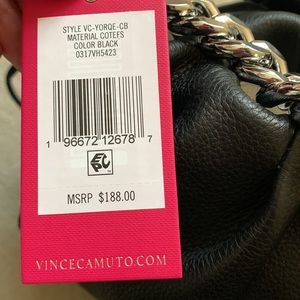 NWT VINCE CAMUTO BLACK LEATHER BAG. Super cute. Can be carries with just the heavy chain or can be used as a crossbody (removable long strap). Two drawstrings on the outside. Inside is cream color w/1 zip compartment and 2 slide compartments. Measures approx 12”