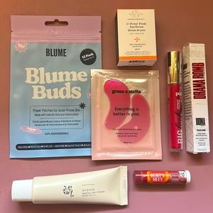 This group includes: Blume Buds-Power Patches for Acne-Prone skin. Blume claims these are the most gentle, effective and non-irritating way to help reduce the look of blemishes. The pack is one of 12, and they are 100% biodegradable; one pair of Grace & Stella Collagen Boosting Eye Mask (very moisturizing); Drunk Elephant C-Firma Fresh Day Serum to Firm and Brighten skin. This serum needs to be mixed from 2 separate products, which I show in the photos. The box includes instructions; Beauty of Joseon Relief Sun Rice and Probiotics Sunscreen SPF 50 PA ++++. Korean sunscreen that looks great under makeup; Burt’s Bees Tinted Lip Balm in Sienna Rose. Picture shows unbroken safety seal; UOMA Beauty Drama Bomb Extreme Volume Mascara in Black and PUR Big Look mascara with Argan Oil, also in Black.