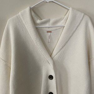 Features: V-neckline, button-front closure, dropped shoulders, ribbed hems, lower back hem