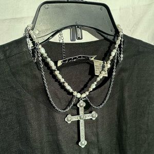 A stunning statement piece! This romantic gothic piece blends traditional motifs with a modern perspective. The metal and pearls are woven together in a layered like style. That beautifully cascade down to a statement cross. Very reminiscent of gorgeous rosary. Etched into the cross is strikingly beautiful, yet delicate detail. Truly a showstopping piece.