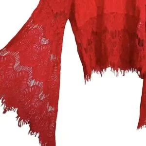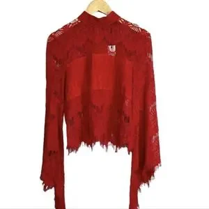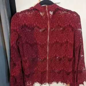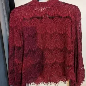 MinkPink Drama Queen Burgundy Lace Zip Back Bell Sleeve Top size M