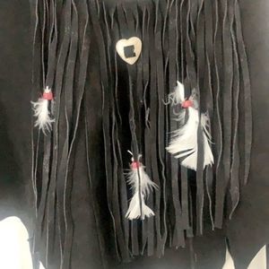 Vintage suede halter top with tassel and feather detailing, and heart hardware.