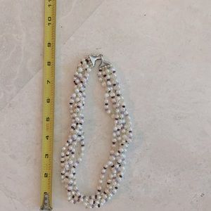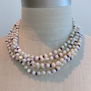 Who doesn’t love a pearl necklace? This one has 5 strands that are interspersed with citrine, peridot, garnet, and amethyst tiny rondelle cut stones and the clasp is sterling silver and easy to open and close. Length with clasp is 18.5”, can be twisted into a torchon to shorten length and provide another look.